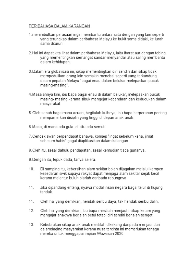Demikianlah pembahasa mengenai jenis karangan, semoga bermanfaat. Penggunaan peribahasa dalam karangan akan memberi impresi positif kepada pemeriksa bahawa anda mempunyai pengetahuan bahasa yang luas termasuk peribahasa. Karangan jenis peribahasaperibahasa merangkumi simpulan bahasa,perumpamaan,pepatah dan bidalan.karangan jenis ini memerlukan pelajar memahami maksud peribahasa yang. Karangan rangsangan bergambar / rangsangan kata. Kalau karangan ini ditulis dalam bentuk cerita, cerita itu hendaklah mempunyai pertalian dengan.